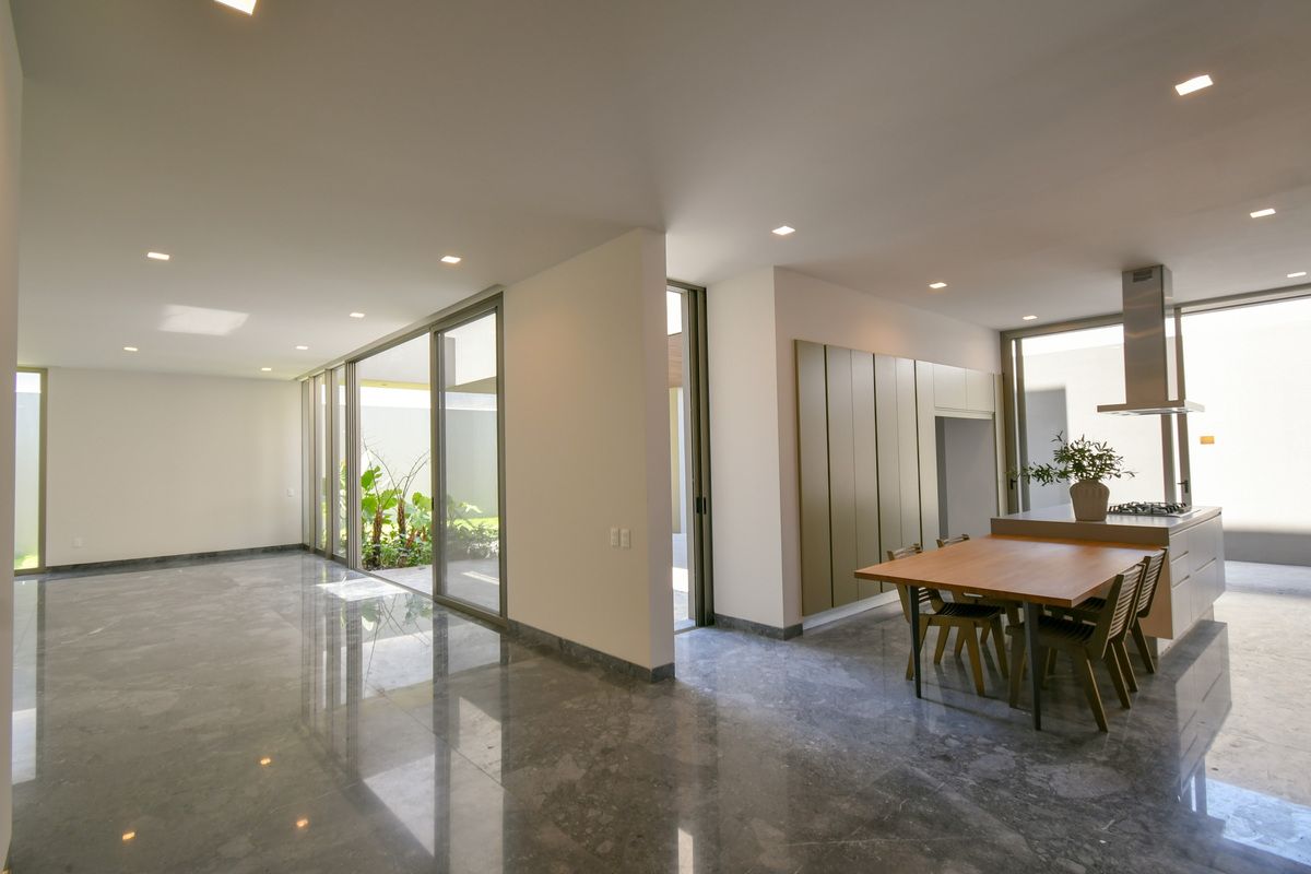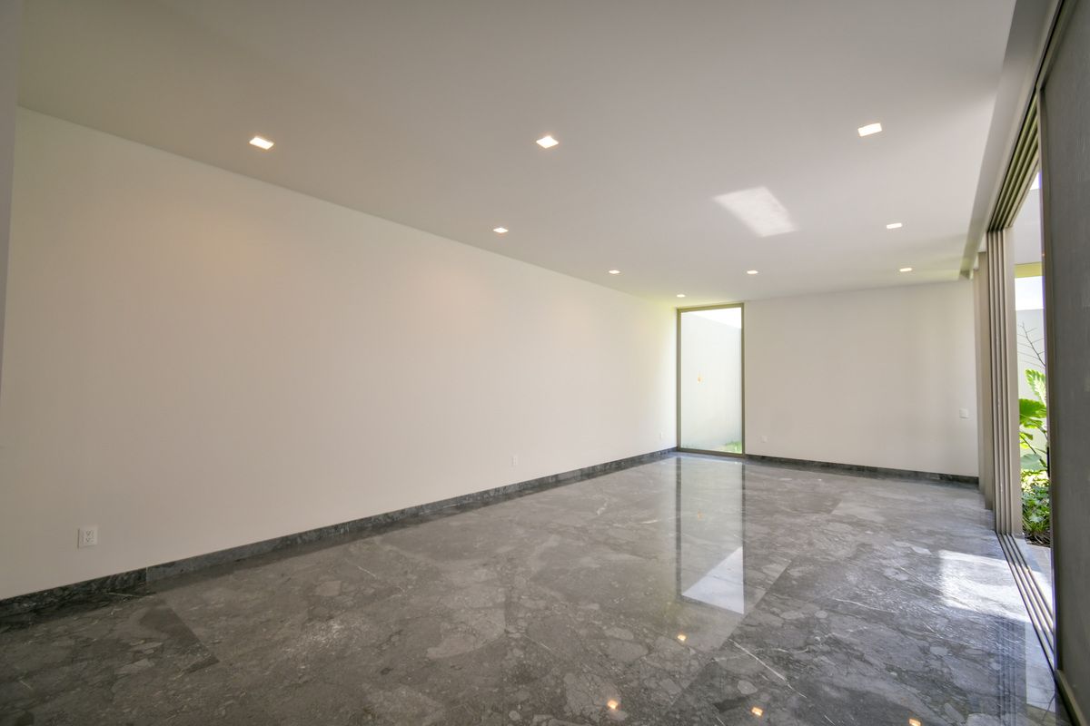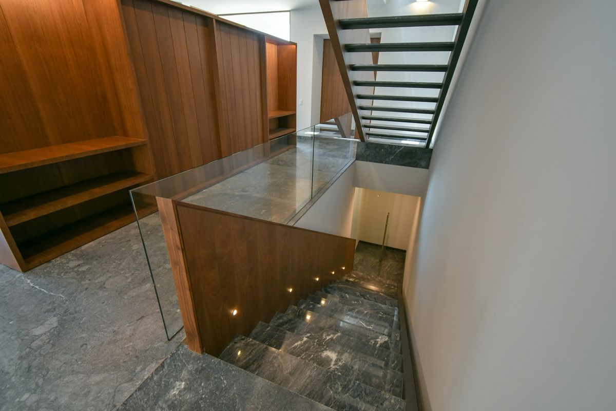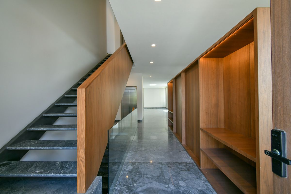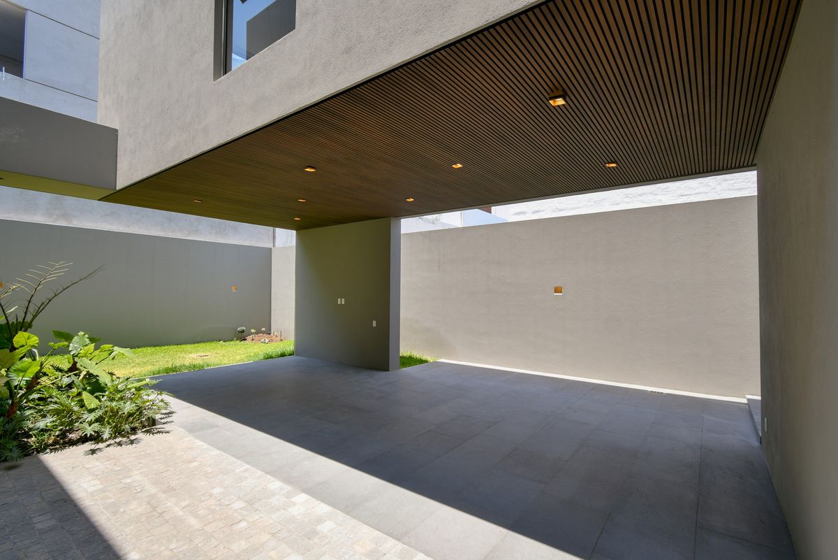 Exclusiva residencia con acabados de lujo y diseño único. Sótano con cochera para 6 autos, iluminación por sensor, trampa de lodo para RZR y bodega con preparación para lavandería. Planta baja cuenta con un recibidor que divide un family room (posible habitación), baño completo, cocina con barra de cuarzo, electrodomésticos GE Profile y acabados de primera calidad, además de una terraza decorada con plantas y un amplio espacio de sala-comedor. Planta alta incluye estar de TV, recámara principal con baño completo y vestidor, y 3 recámaras secundarias con baño y closet. Roof garden con cuarto de servicio, baño completo y lavandería. La propiedad destaca por sus pisos de mármol importado, duela de ingeniería, carpintería en nogal, elevador con generador de energía y sistema de riego en jardineras.