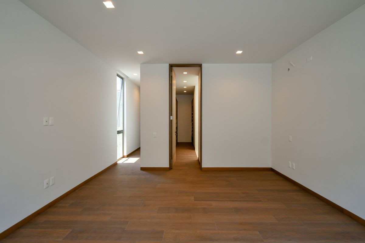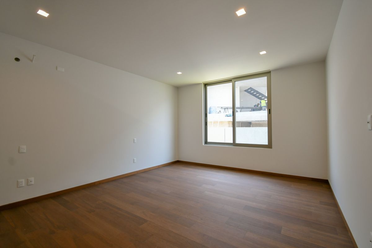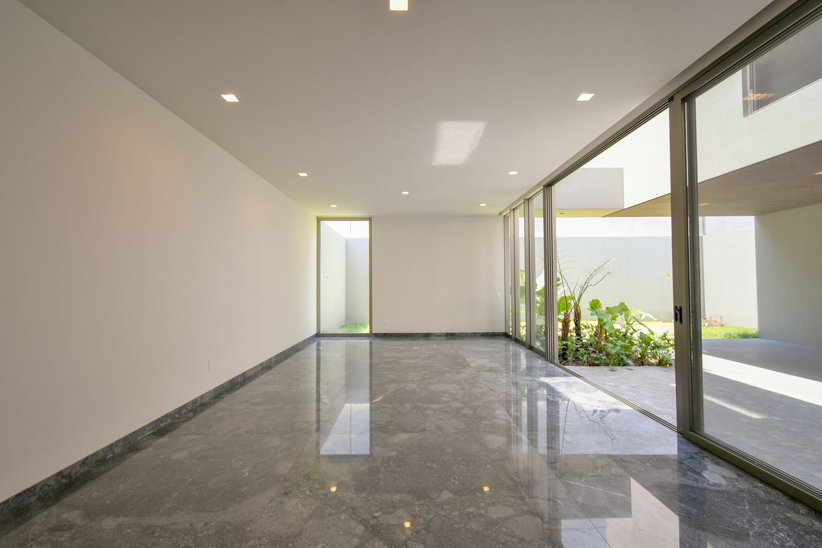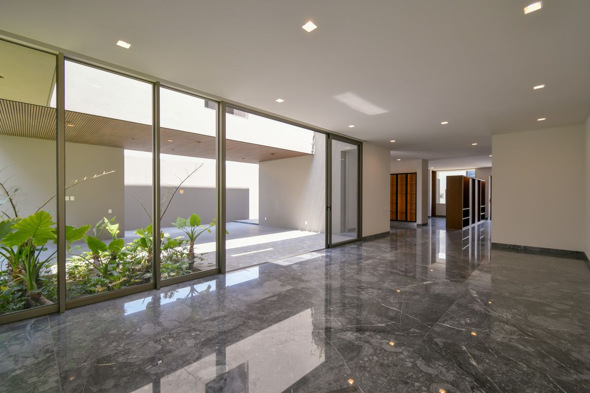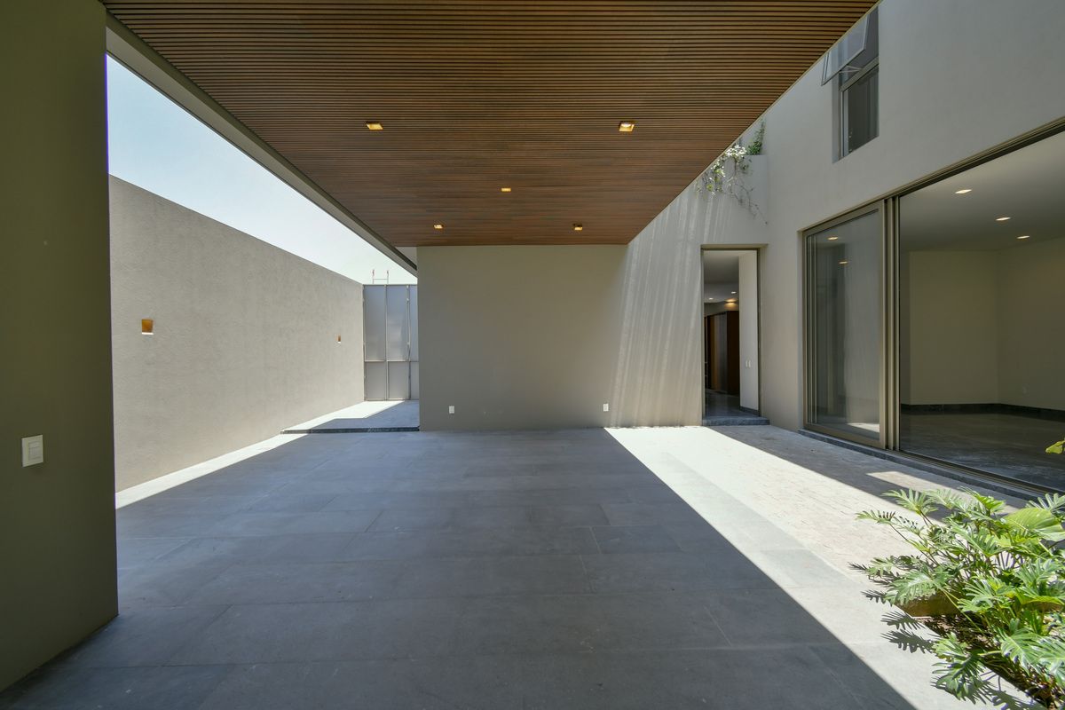 Exclusiva residencia con acabados de lujo y diseño único. Sótano con cochera para 6 autos, iluminación por sensor, trampa de lodo para RZR y bodega con preparación para lavandería. Planta baja cuenta con un recibidor que divide un family room (posible habitación), baño completo, cocina con barra de cuarzo, electrodomésticos GE Profile y acabados de primera calidad, además de una terraza decorada con plantas y un amplio espacio de sala-comedor. Planta alta incluye estar de TV, recámara principal con baño completo y vestidor, y 3 recámaras secundarias con baño y closet. Roof garden con cuarto de servicio, baño completo y lavandería. La propiedad destaca por sus pisos de mármol importado, duela de ingeniería, carpintería en nogal, elevador con generador de energía y sistema de riego en jardineras.
