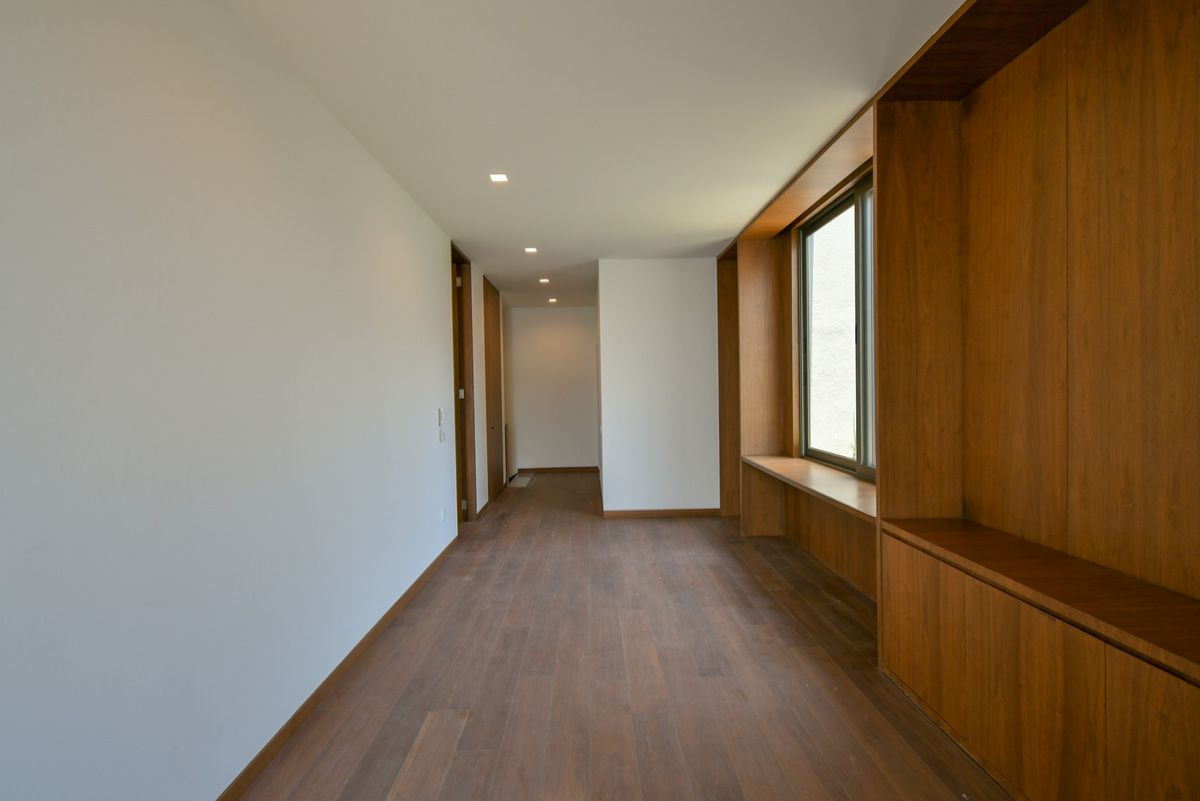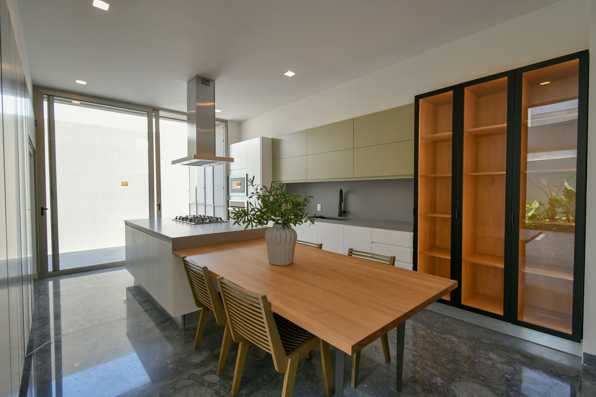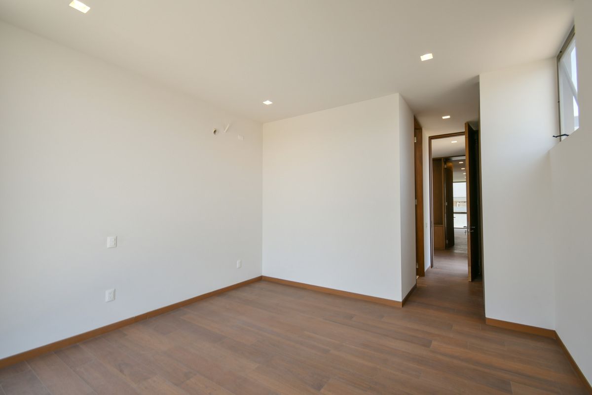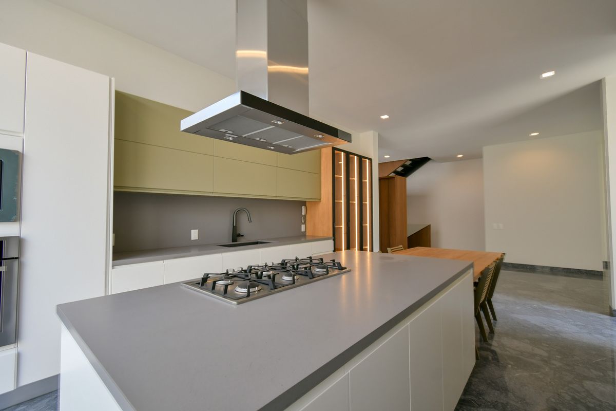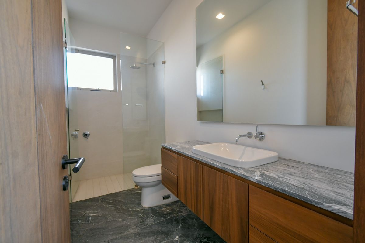 Exclusiva residencia con acabados de lujo y diseño único. Sótano con cochera para 6 autos, iluminación por sensor, trampa de lodo para RZR y bodega con preparación para lavandería. Planta baja cuenta con un recibidor que divide un family room (posible habitación), baño completo, cocina con barra de cuarzo, electrodomésticos GE Profile y acabados de primera calidad, además de una terraza decorada con plantas y un amplio espacio de sala-comedor. Planta alta incluye estar de TV, recámara principal con baño completo y vestidor, y 3 recámaras secundarias con baño y closet. Roof garden con cuarto de servicio, baño completo y lavandería. La propiedad destaca por sus pisos de mármol importado, duela de ingeniería, carpintería en nogal, elevador con generador de energía y sistema de riego en jardineras.