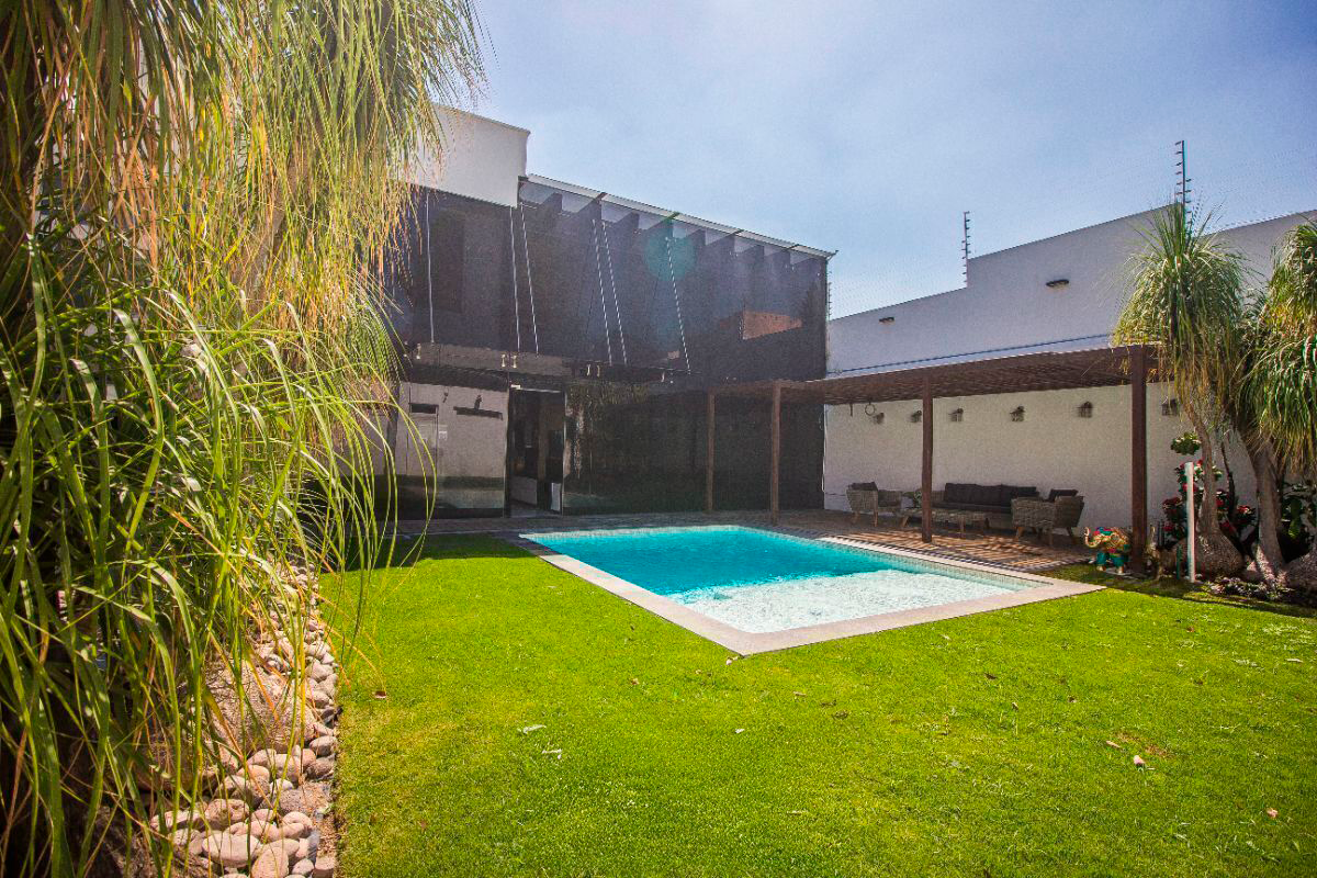 Espectacular residencia moderna en venta en Lomas del Valle, junto a Colinas de San Javier, con un precio de $54,980,000, que destaca por su amplitud, lujo y exclusividad; cuenta con 1,056 m² de terreno y 1,300 m² de construcción, distribuidos en 5 recámaras con baño completo y vestidor, tres de ellas en planta baja, mientras que la recámara principal se ubica en planta alta con amplio walking clóset, jacuzzi y vapor, además de un bungalow independiente ideal como recámara de huéspedes, gimnasio o área de esparcimiento; la propiedad ofrece sala y comedor de gran tamaño con doble altura integrados a una sala de cine y bar, cocina abierta con acabados de lujo, gran despensa, área de juegos infantiles, terraza con alberca climatizada y hermoso jardín, cochera techada para 5 autos, dos cuartos de servicio con baño completo y paneles solares, todo dentro de una de las colonias más reconocidas, elegantes y emblemáticas de Guadalajara.