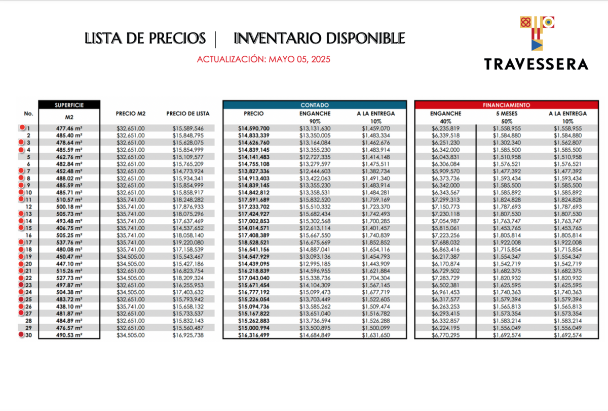 Terrenos en venta dentro del exclusivo Coto Travessera, ubicado sobre Av. Juan Palomar y Arias, en el corazón de Paseo de Gracia, una de las zonas con mayor plusvalía y prestigio de Guadalajara; este nuevo fraccionamiento de lujo cuenta con 47 lotes residenciales rodeados de amplias áreas verdes, ideales para construir la casa de tus sueños en un entorno seguro, privado y familiar. Disponibilidad de terrenos desde 456 m² hasta 505 m², con precios aproximados entre $14,000,000 y $17,000,000 MXN, además de planes de financiamiento de hasta 10 meses y descuentos por pago de contado. Una oportunidad única para vivir o invertir en una ubicación privilegiada. Verificar disponibilidad. Precios y condiciones sujetos a cambios sin previo aviso.